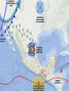 Para este miércoles, el frente frío núm. 7 se desplazará sobre el noroeste del país, que en interacción con una vaguada en altura y la corriente en chorro subtropical, generarán fuertes rachas de viento de 45 a 60 km/h en Baja California, Baja California Sur, golfo de California, Chihuahua y Sonora; así como lluvias fuertes con descargas eléctricas y caída de granizo en zonas de Chihuahua.
