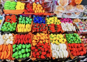 Entre los dulces de alfeñique están con formas de ataúdes, cráneos, cruces, borregos, venados, huesos, procesiones, ángeles, animales, frutas, y hasta miniaturas de platillos típicos muy mexicanos. Algo que sin duda podrás encontrar y de los que te enamorarás para llevar y colocar en la elaboración de los altares para la noche de muertos .