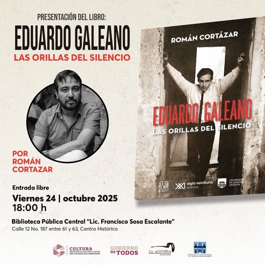 El Instituto de Cultura y Artes del Estado de Campeche invita a la presentación del libro Eduardo Galeano. Las Orillas del Silencio de Román Cortázar, un ensayo que se ajusta a su propia naturaleza: una exploración literaria. Román Cortázar husmea en las huellas que Galeano dejó en las publicaciones periódicas que dirigió o en las que colaboró; examina aquellos tanteos con la palabra y recupera un puñado de textos que yacían olvidados en los anaqueles de las bibliotecas de Montevideo y Buenos Aires. Las orillas de la palabra empiezan o terminan en las orillas de la sociedad.