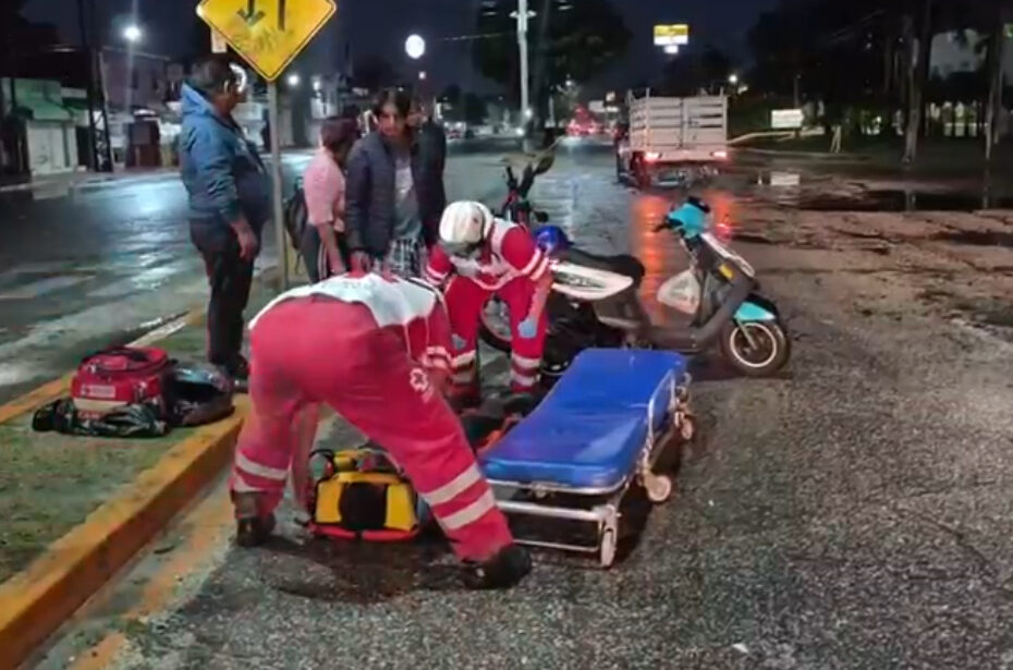 Tras el fuerte choque, ambos conductores salieron proyectados y cayeron sobre el pavimento. La mujer resultó con una lesión en la pierna derecha, mientras que el joven, presunto responsable del percance, presentó fuertes golpes en diversas partes del cuerpo y una posible fractura que le impidió ponerse de pie.