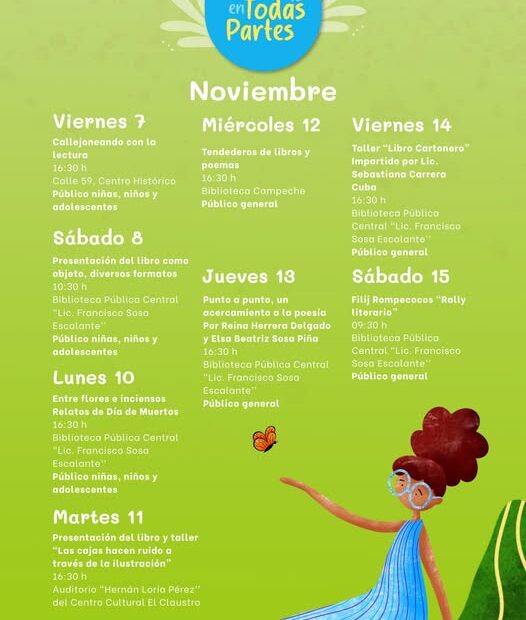 Las actividades arrancarán el viernes 7 de noviembre a las 16:30 horas con “Callejoneando con la lectura”, una dinámica de lectura al aire libre que tendrá lugar en el Centro Histórico de San Francisco de Campeche. Esta actividad vespertina invita a niñas, niños y adolescentes a disfrutar de narraciones en un ambiente único, rodeados por la arquitectura colonial y la atmósfera del atardecer campechano.