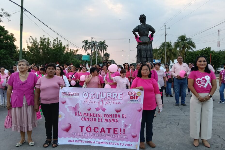 El DIF Municipal de Palizada realizó la marcha en conmemoración de la lucha contra el cáncer de mama, en la que personal del ayuntamiento, familias y maestros del CECyTE plantel Palizada se dieron cita.