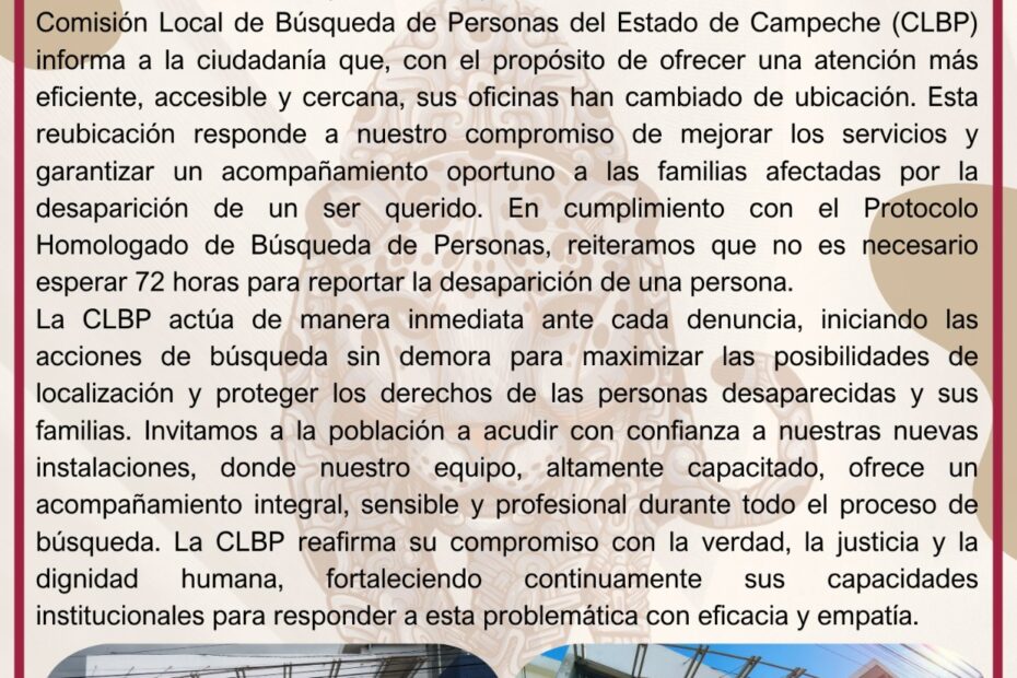 La Comisión Local de Búsqueda de Personas del Estado de Campeche (CLBP) informa a la ciudadanía que, con el propósito de ofrecer una atención más eficiente, accesible y cercana, sus oficinas han cambiado de ubicación. Esta reubicación responde a nuestro compromiso de mejorar los servicios y garantizar un acompañamiento oportuno a las familias afectadas por la desaparición de un ser querido.