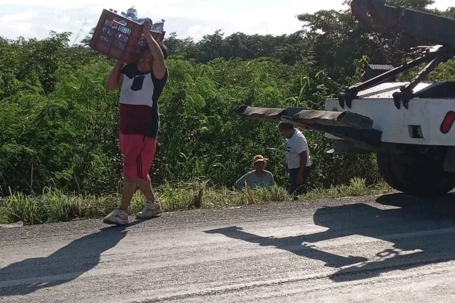 Pobladores y testigos de un accidente ocurrido en la carretera federal Escárcega a Villahermosa, en el tramo del campo experimental El Tormento, saquearon la carga de una pesada unidad que volcó cuando el operador se dormitó al volante.