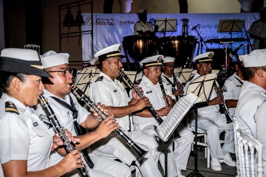 El repertorio incluyó piezas emblemáticas como El Huapango de Moncayo, Caminante del Mayab, México en la piel y el emotivo popurrí La Novia del Mar, interpretadas con gran maestría por la Banda Sinfónica y el Mariachi de la SEMAR.