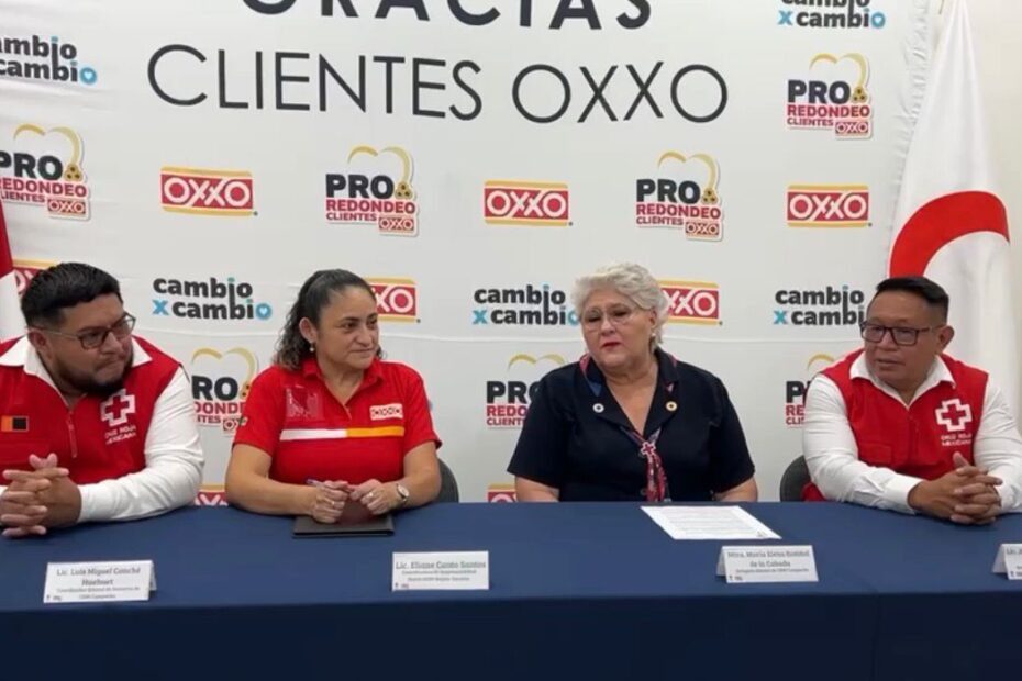 La delegada de la Cruz Roja en Campeche es María Elena Rosiñol de la Cabada dijo que como parte de la campaña de redondeo “Cambio x Cambio”, realizada de enero a marzo de 2026, tiendas OXXO de la región Yucatán y Campeche lograron recaudar $430,763.46 pesos, recurso que fue entregado a la Cruz Roja Mexicana Base Estatal Campeche.