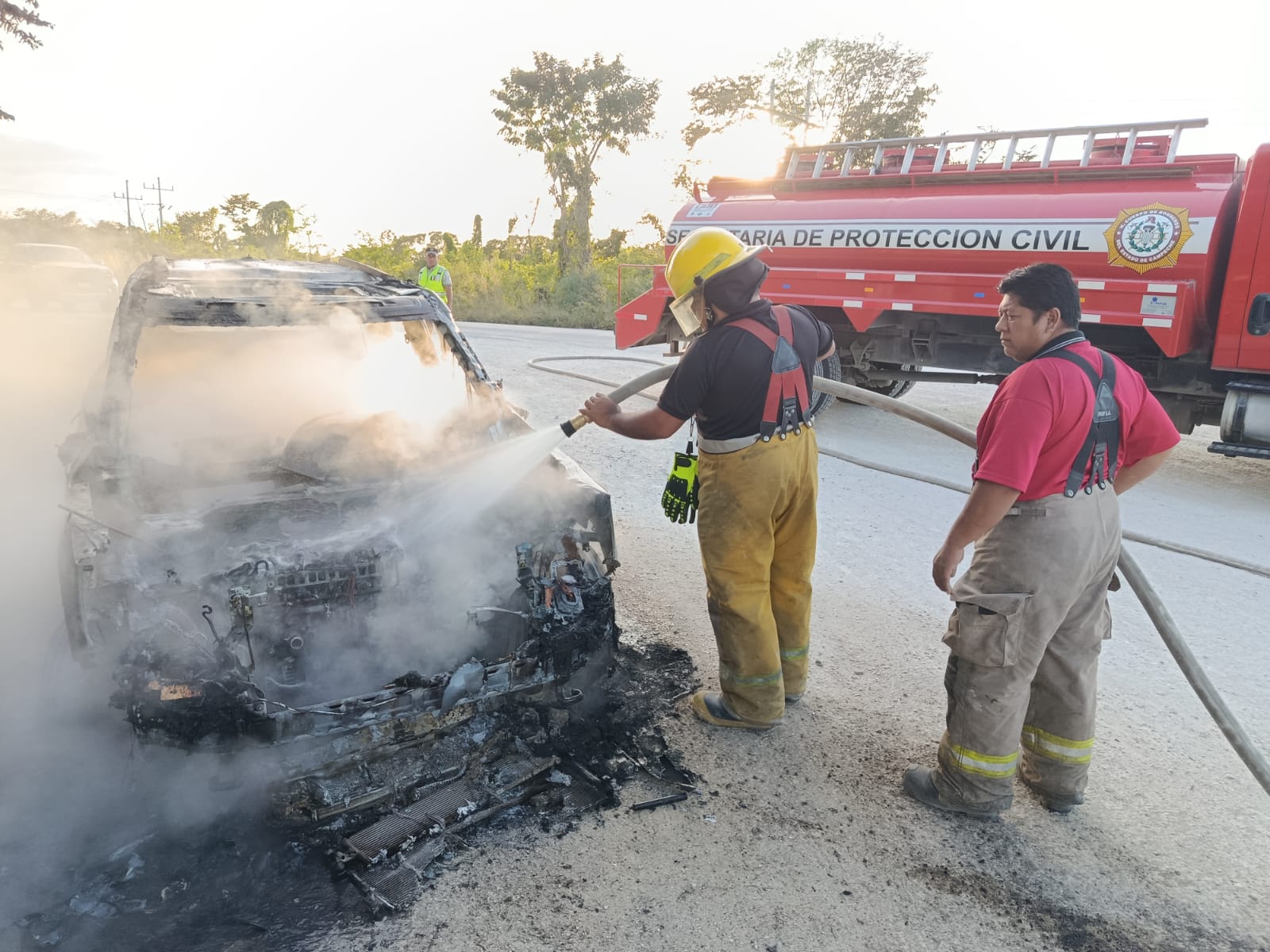 Elementos del departamento de Bomberos de Escárcega atendieron el incendio de una camioneta que se encontraba sobre el kilómetro 8 de la carretera 18 de Marzo a Sabancuy, sin que hasta el momento se pueda confirmar las causas que ocasionaron el siniestro.