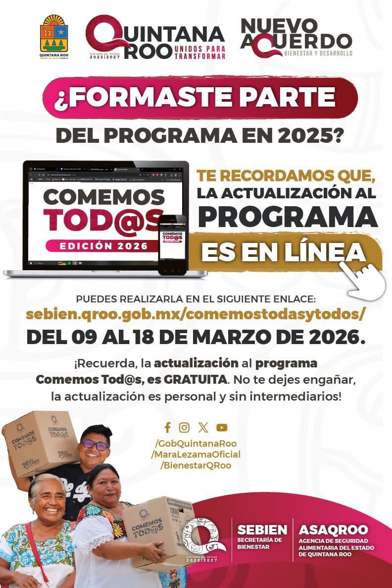 La gobernadora Mara Lezama Espinosa informó que este 6 de marzo se lleva a cabo el registro para el programa social “Comemos Todas y Todos” en su edición 2026, una estrategia dirigida a fortalecer la seguridad alimentaria y apoyar la economía de miles de hogares en el estado.