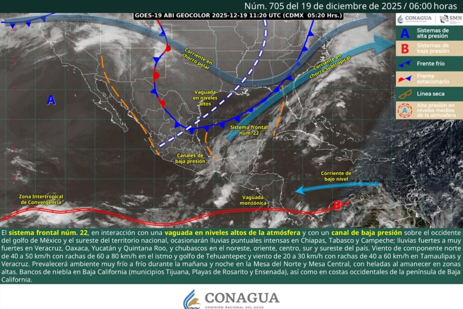 El sistema frontal núm. 22 se extenderá sobre el norte del golfo de México y noreste del país, en interacción con una vaguada en niveles altos de la atmósfera extendida desde el noreste hasta el occidente de México y con un canal de baja presión sobre el occidente del golfo de México y el sureste del territorio nacional ocasionarán lluvias puntuales intensas en Chiapas (norte y este), Tabasco (sur y este) y Campeche (centro y suroeste); lluvias fuertes a muy fuertes en zonas de Veracruz (Papaloapan, Los Tuxtlas y Olmeca), Oaxaca (norte y este), Yucatán y Quintana Roo, así como lluvias con chubascos en zonas del noreste, oriente, centro, sur y sureste del país. A su vez, se prevé viento de componente norte de 40 a 50 km/h con rachas de 60 a 80 km/h en el istmo y golfo de Tehuantepec (Oaxaca y Chiapas) y viento de 20 a 30 km/h con rachas de 40 a 60 km/h en Tamaulipas y Veracruz. Por otro lado, continuará el ambiente muy frío a frío durante la mañana y noche sobre entidades de la Mesa del Norte y la Mesa Central, con heladas al amanecer en zonas altas. Además, se espera la formación de bancos de niebla en Baja California (municipios de Tijuana, Playas de Rosarito y Ensenada), así como en zonas costeras del occidente de la península de Baja California.