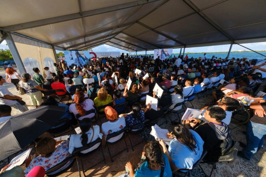 La entrega se realizó en la explanada del Malecón Tajamar, en donde la Gobernadora destacó que la mejor manera de celebrar 56 años de Cancún es haciendo justicia social, en un evento con el pueblo, con la familia que esperaron largos años para tener los papeles que les dan certeza jurídica sobre su propiedad.