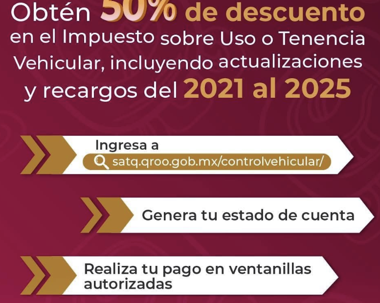 Asimismo, recordó que durante los primeros tres meses del año, conforme a lo establecido en la ley estatal, se llevará a cabo el cambio de placas en Quintana Roo, por lo que será necesario cubrir el pago de la tarjeta de circulación, con un costo de 141 pesos, además del importe correspondiente a las placas, el cual varía dependiendo de si se trata de un automóvil o una motocicleta.