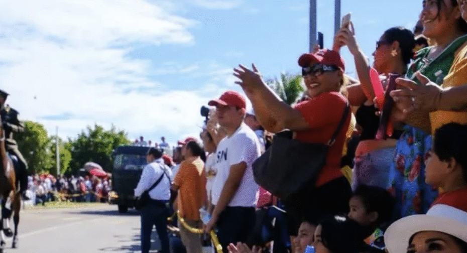 Desde las gradas instaladas para el público y posteriormente a pie de calle, la gobernadora convivió con niñas, niños y familias que siguieron con entusiasmo el paso de los contingentes. Antes del desfile, Mara Lezama Espinosa encabezó, junto con autoridades civiles y militares, la ceremonia de izamiento de la bandera monumental frente al Palacio de Gobierno.