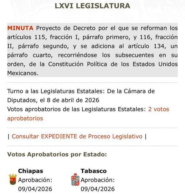 De acuerdo al portal de la Cámara de Diputados, el Congreso de Chiapas decidió en unidad, ser el primero en aprobar por mayoría el proyecto de decreto por el que se reforman los artículos 115, fracción I, párrafo primero, y 116, fracción II, párrafo segundo, y se adiciona al artículo 134, un párrafo cuarto, recorriéndose los subsecuentes en su orden, de la Constitución Política de los Estados Unidos Mexicanos.