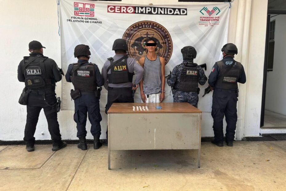 La Secretaría de Seguridad del Pueblo (SSP), a través de la Guardia Estatal Fronteriza, Fuerza de Reacción Inmediata Pakal (FRIP), Guardia Estatal Preventiva, en coordinación con la Agencia de Investigación e Inteligencia Ministerial (AIIM) de la Fiscalía General del Estado (FGE), detuvieron a una persona del sexo masculino como presunto responsable de delitos contra la salud en su modalidad de posesión simple, en Tapachula.
