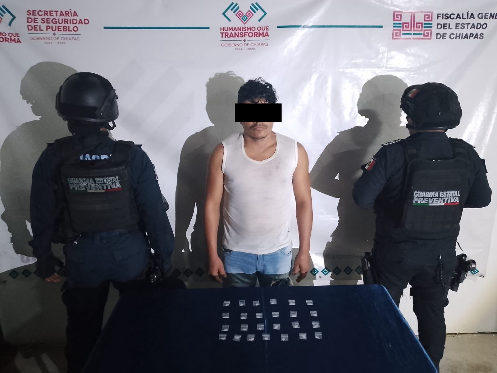 Con el fin de hacer cumplir la ley y garantizar el Estado de Derecho de la ciudadanía chiapaneca y en respuesta a una denuncia anónima al Escudo Pakal (C5), por venta de narcóticos, guardias estatales detuvieron a Alexander “N” alias “Chanti”, a quien le aseguraron 25 dosis con las características de la droga conocida como cristal en el ejido Lagartero.