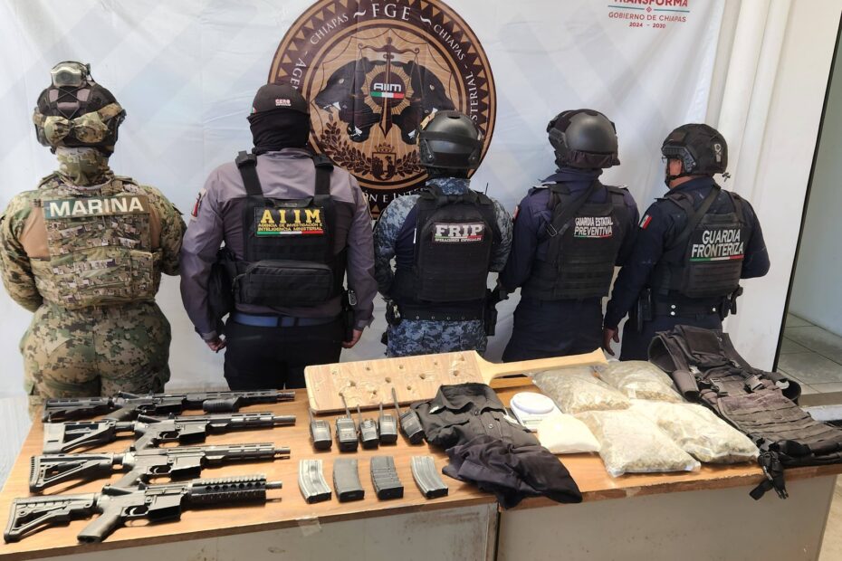 El Grupo interinstitucional, conformado por la Fiscalía General del Estado, la Secretaría de la Defensa Nacional, la Guardia Nacional y la Secretaría de Seguridad del Pueblo, realizaron diligencias de cateo en tres inmuebles ubicados en el municipio de Huixtla, donde se aseguraron armas largas, droga, equipo táctico y vehículos.