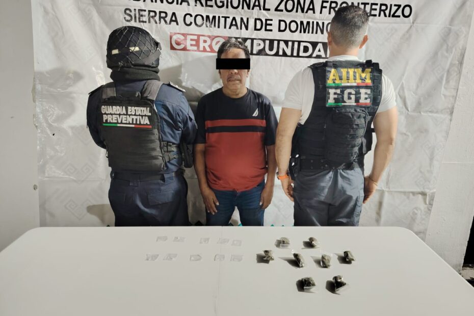 La Fiscalía General del Estado y la Secretaría de Seguridad del Pueblo detuvieron en flagrancia a José “N”, como presunto responsable del delito contra la salud, en su modalidad de posesión con fines de comercio del narcótico denominado mariguana y cristal, cometido en agravio de la sociedad, por hechos ocurridos en el barrio Los Sabinos, del municipio de Comitán de Domínguez.