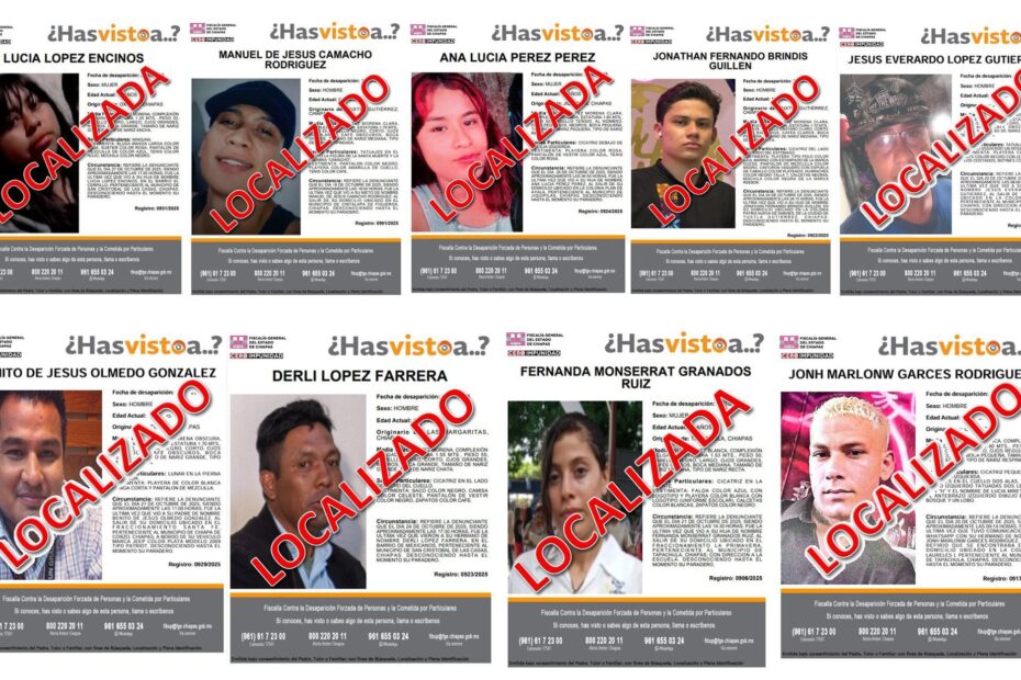 La Fiscalía General del Estado presentó a nueve personas, quienes contaban con reporte de No Localizadas en los municipios de Tuxtla Gutiérrez, Arriaga, Oxchuc, Tapachula, Las Margaritas, Cintalapa y Jiquipilas, los cuales son hechos aislados entre sí.