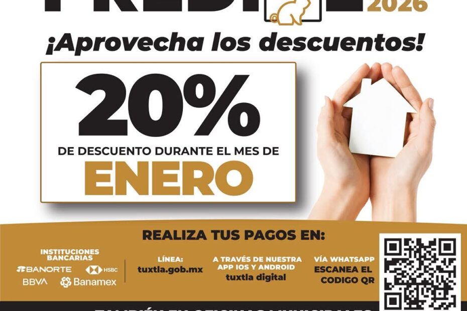 El Ayuntamiento de Tuxtla Gutiérrez invita a las y los tuxtlecos a aprovechar los dos últimos días de descuento del 20% en el pago del impuesto predial, viernes 30 y sábado 31 de enero, apoyo directo a la economía familiar y que también contribuye al desarrollo de la capital chiapaneca.