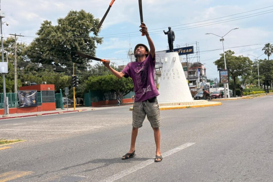 Desde Ecatepec, Estado de México, Luis Alberto Pérez Tejeda ha hecho de los semáforos su escenario y de los malabares su forma de vida. Con machetes en mano y cicatrices en el cuerpo como testigo, Luis lleva más de ocho años perfeccionando su arte callejero, viajando por 16 estados de la República, acompañado de su esposa y su perrita.