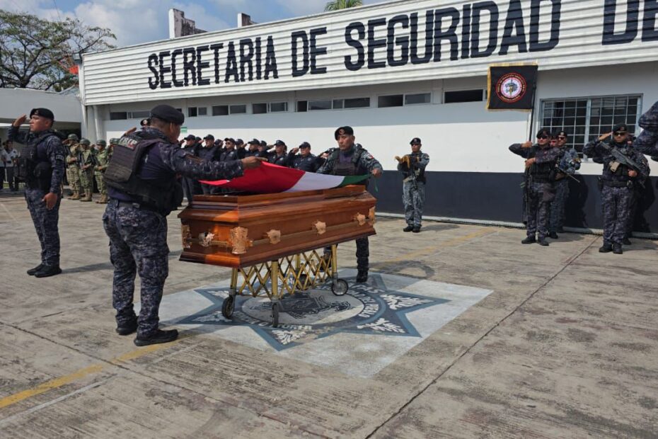 En las instalaciones del sector número V de Tapachula, autoridades de la SSP encabezada por el director de la Guardia Estatal Fronteriza, Comisario Diego Echavarría Lara; encargada de la Delegación Administrativa Tapachula, Inspector Jefe, Domitila Vanessa López Andrade; y el jefe de la base de operaciones de la FRIP en Tapachula, Inspector, Carlos Melitón García López, rindieron homenaje de cuerpo presente al elemento, Jorge Velázquez Segovia.