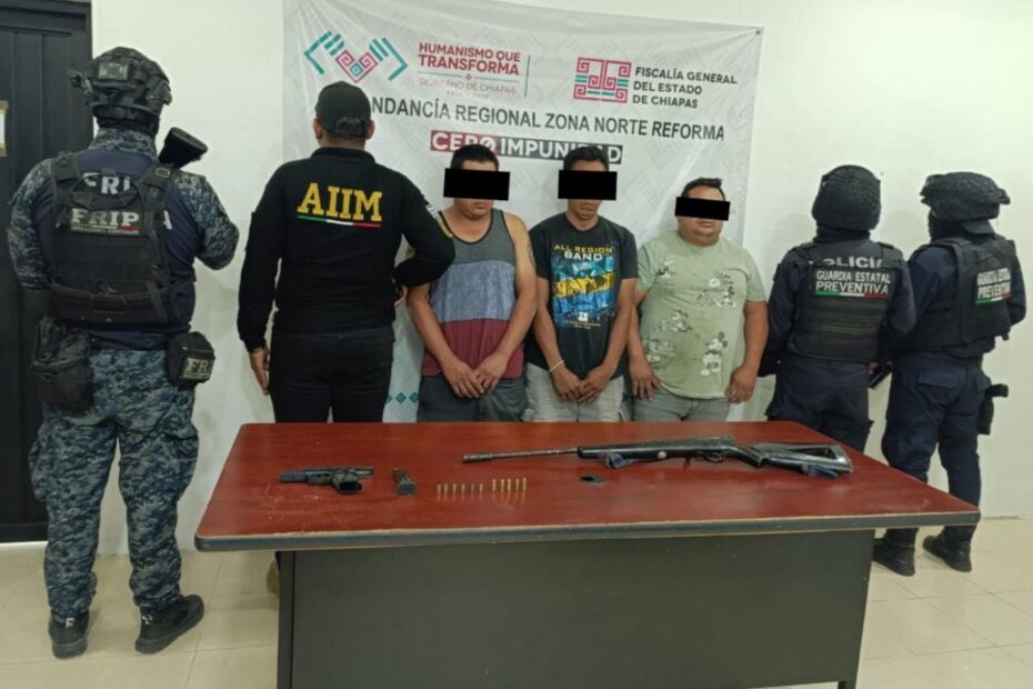 La Secretaría de Seguridad del Pueblo (SSP) a través de Fuerza de Reacción Inmediata Pakal (FRIP) y la Guardia Estatal Preventiva, en coordinación con la Agencia de Investigación e Inteligencia Ministerial (AIIM) de la Fiscalía General del Estado (FGE) y la Secretaría de Seguridad y Protección Ciudadana (SSPC) del Gobierno Federal, detuvieron a tres personas por el probable delito de violación a la Ley Federal de armas de fuego, en el municipio de Tapilula.