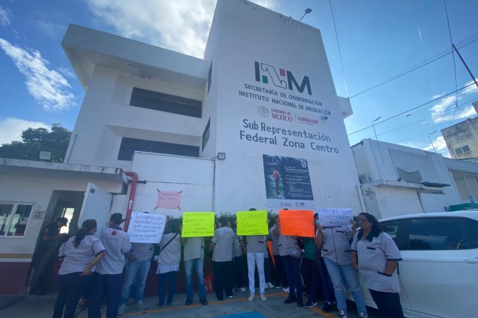 Un grupo de trabajadores del área de limpieza se manifestó a las afueras del instituto nacional de migración en Tuxtla Gutiérrez, luego de asegurar que no han recibido su salario pese a continuar laborando en turnos de ocho horas diarias.