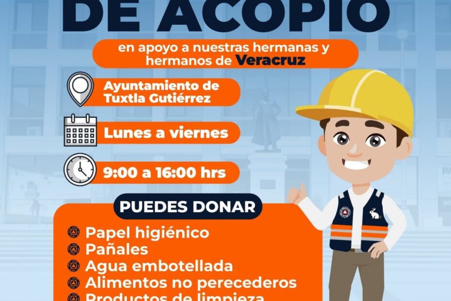 Dicho centro está instalado en el patio de la presidencia municipal de lunes a viernes, en un horario de 9:00 a 16:00 horas. Las y los tuxtlecos pueden acudir a donar: agua embotellada, alimentos no perecederos, pañales, papel higiénico, productos de limpieza y de aseo personal.