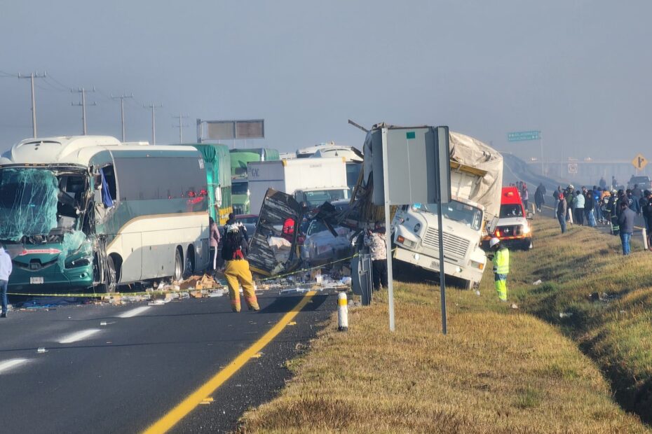 El primer percance involucró a un camión de pasajeros de la línea Flecha Roja con número económico 1106 y a un camión tipo torton que transportaba cajas de cartón con diversos artículos, resultandos afectados varios vehículos particulares al no lograr frenar a tiempo, dejando como saldo al menos tres personas fallecidas y varias lesionadas.