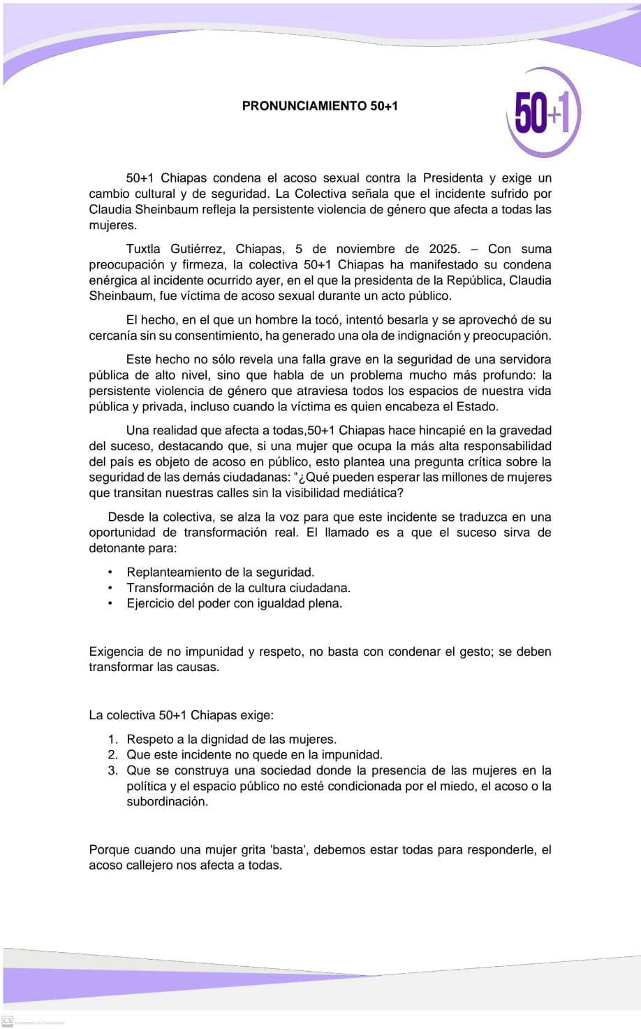 Con suma preocupación y firmeza, la colectiva 50+1 Chiapas manifiesta su condena enérgica al incidente ocurrido ayer, en el que la presidenta de la República, Claudia Sheinbaum, fue víctima de acoso sexual durante un acto público.