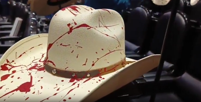Previo a la sesión ordinaria, las bancadas del PAN y del PRI colocaron sombreros en sus curules, con pintura roja, aparentando sangre, y veladoras de plástico en memoria del presidente municipal.