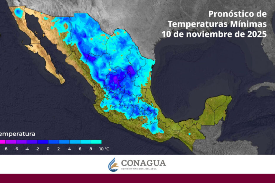 Las temperaturas más bajas se registrarán en las zonas montañosas del norte, con mínimas de -15 a -10 grados Celsius en Chihuahua y Durango, así como de -10 a -5 grados en sierras de Baja California, Nuevo León y Zacatecas. También se prevén heladas de -5 a 0 grados en regiones altas de Sonora, Coahuila, San Luis Potosí, Hidalgo, Estado de México, Tlaxcala, Puebla y Veracruz, y valores de 0 a 5 grados en zonas serranas de Tamaulipas, Aguascalientes, Jalisco, Michoacán, Guanajuato, Querétaro, Ciudad de México y Oaxaca.