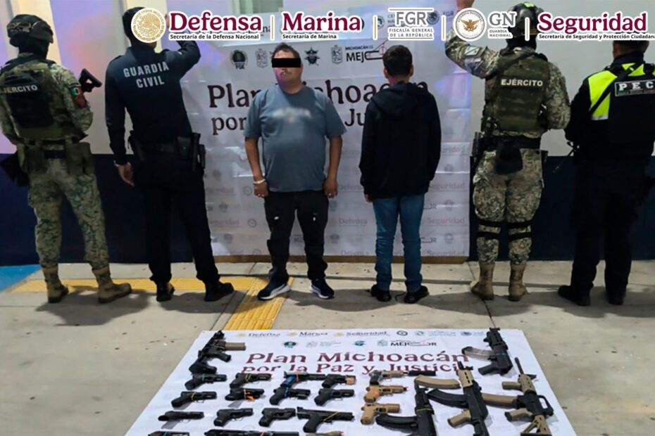 Como parte de las acciones del Plan Michoacán por la Paz y la Justicia, elementos de la Secretaría de la Defensa Nacional (Defensa) y Guardia Nacional (GN), en coordinación con la Secretaría de Marina (Semar), Fiscalía General de la República (FGR) y Secretaría de Seguridad y Protección Ciudadana (SSPC), junto con autoridades locales, detuvieron a tres personas, aseguraron 36 armas de fuego, 1,086 cartuchos, 61 cargadores, un artefacto explosivo improvisado, nueve vehículos y equipo táctico.