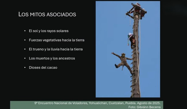 El mito, contenido en el relato del Popol Vuh, el libro sagrado de los mayas, establece que el juego de pelota es la llave para entrar al inframundo, mientras que en el caso de los voladores no hay nada escrito, es parte de la sabiduría oral y se trata de un ciclo de renovación que simboliza el ascenso al supramundo, anotó.