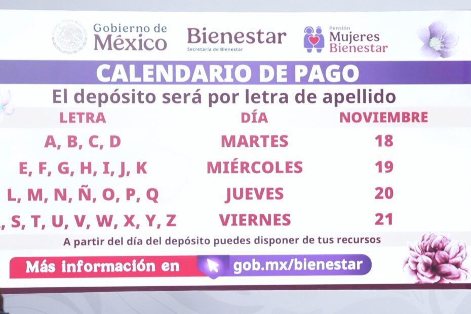 El Gobierno de México, a través de la Secretaría de Bienestar, informó que, del 18 al 21 de noviembre, las mexicanas de entre 60 y 64 años que se registraron en agosto a la Pensión Mujeres Bienestar y recibieron su tarjeta en octubre, se les otorgará su primer pago de este apoyo de 3 mil pesos bimestrales.