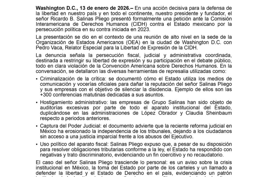 El consorcio empresarial Grupo Salinas dio a conocer que presentó una petición formal ante la Comisión Interamericana de Derechos Humanos (CIDH) en contra del Estado mexicano, al considerar que ha sido objeto de una serie de acciones que configuran una presunta persecución política en su contra.
