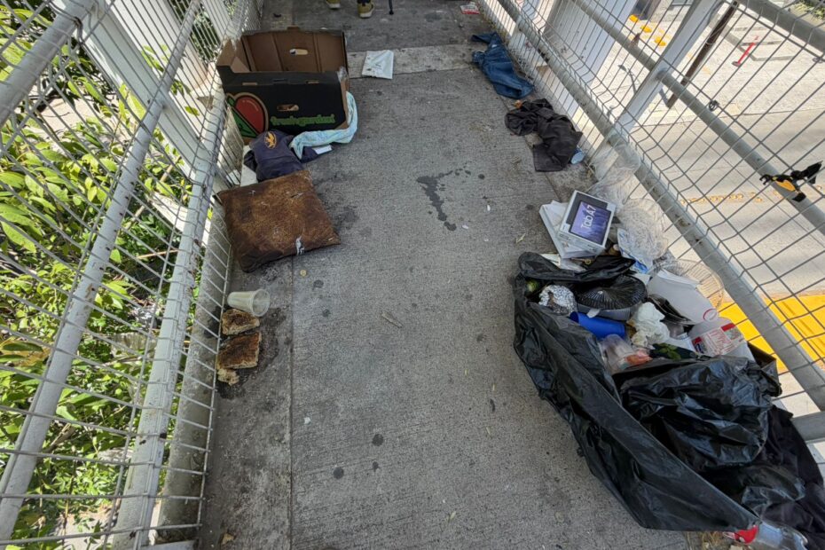 Tenis, pantalones y basura son los artículos que resguardan aparentemente personas en situación de calle en el puente peatonal ubicado en av. López mateos al cruce con la calle Antonio Valeriano en la colonia chapalita en el municipio de Guadalajara.