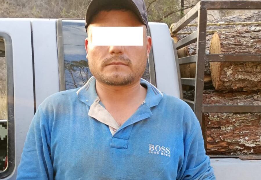 Elementos de la Policía Estatal de Caminos detuvieron a dos hombres por presuntamente transportar madera de forma ilegal en la carretera San Andrés Ixtlán-Unión de Guadalupe, en Gómez Farías.