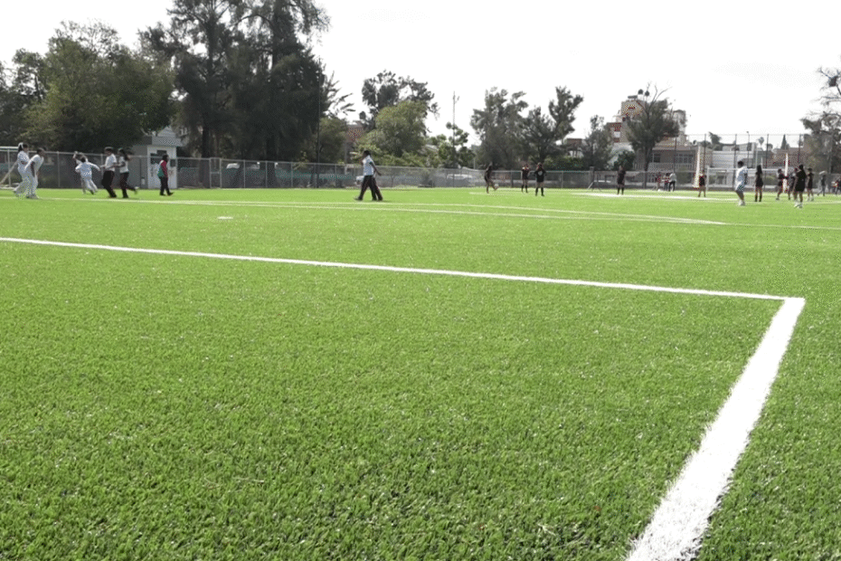 La remodelación incluyó la colocación de pasto sintético híbrido, reforzamiento de porterías, mejoras en la iluminación, backstops y nivelación de la superficie con una capa de asfalto.