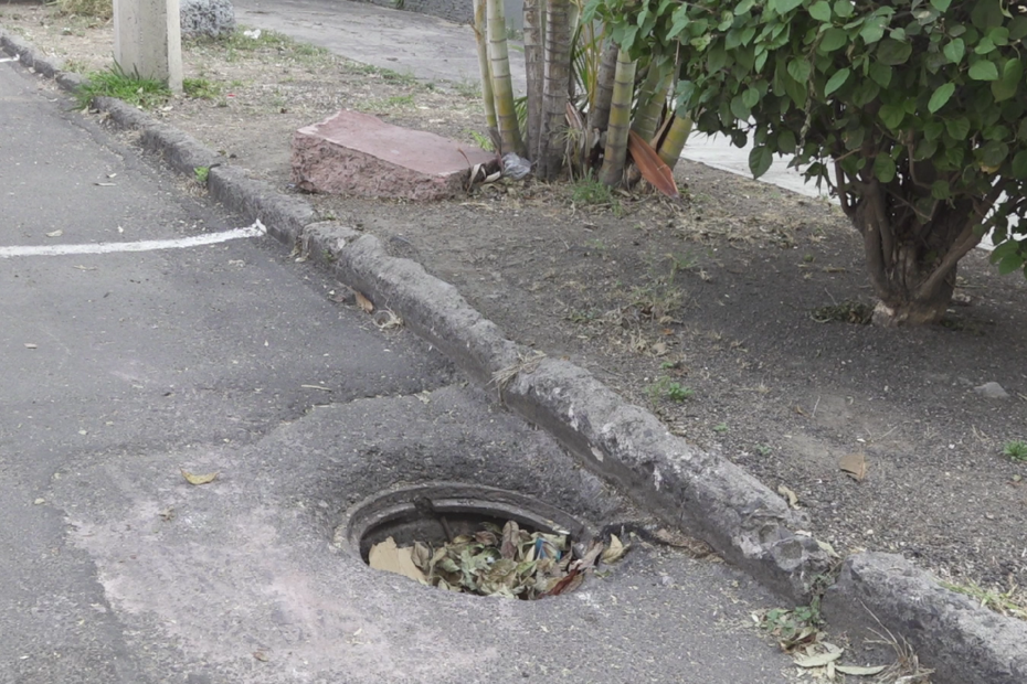 El orificio, ubicado a un costado de la banqueta, se encuentra expuesto y parcialmente cubierto con hojas, lo que dificulta su visibilidad y aumenta la posibilidad de caídas o accidentes, especialmente durante la noche o en horas de mayor tránsito.