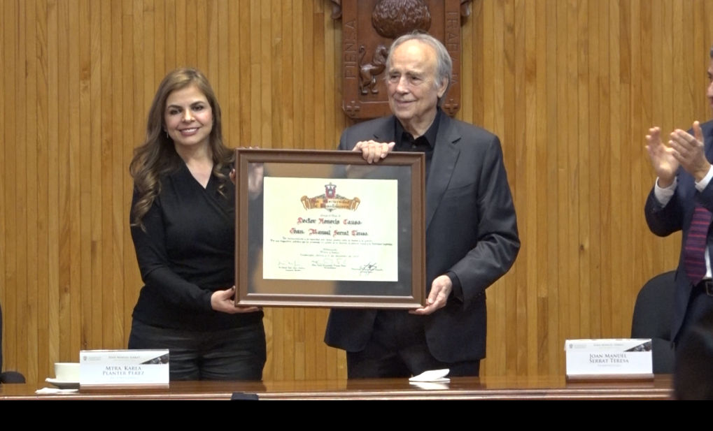 La Universidad de Guadalajara entregó el título de Doctor Honoris Causa al cantautor español Joan Manuel Serrat, uno de los artistas más influyentes de la música en español.