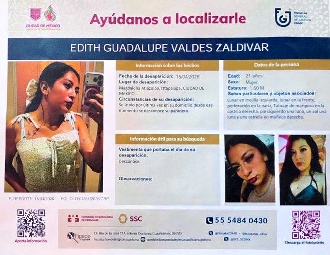 La Fiscalía General de Justicia de la Ciudad de México (FGJ CDMX) informó que, como resultado de las labores de búsqueda e investigación, fue localizada sin vida Edith Guadalupe Valdez Saldívar, de 21 años, quien había sido reportada como desaparecida.