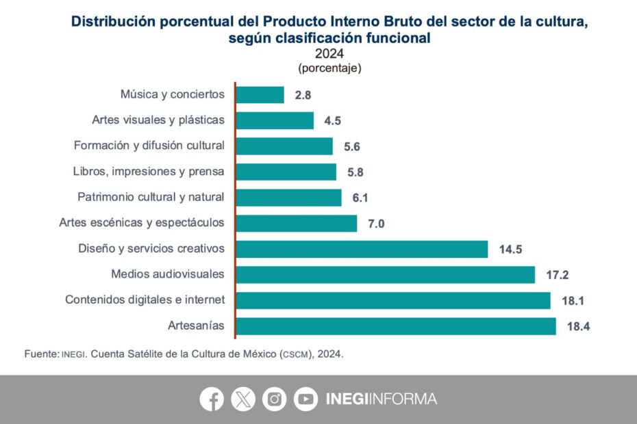 De acuerdo con la clasificación funcional del sector de la cultura, las áreas con mayor contribución al PIB fueron artesanías, con 18.4 por ciento; contenidos digitales e internet, con 18.1 por ciento; medios audiovisuales, con 17.2 por ciento; y diseño y servicios creativos, con 14.5 por ciento.