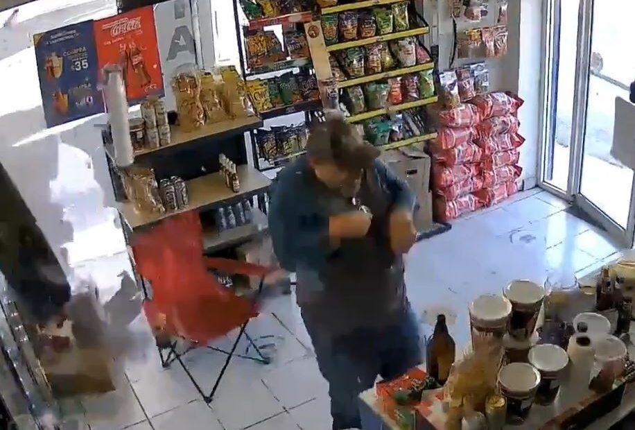 Las cámaras de seguridad del negocio captaron el momento exacto en el que el joven, que se encontraba sentado dentro del establecimiento, se levanta para atender a dos clientes que acababan de llegar. En el video se observa cómo camina hacia el mostrador y se coloca detrás de él, sin imaginar que ese simple movimiento le salvaría la vida.