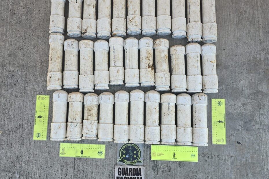 Fueron localizados en una zona serrana de la localidad de Comachuén: dos artefactos explosivos, 32 granadas modificadas para ser lanzadas con drones, una carga explosiva de 350 gramos, y seis porciones de material, sistemas de iniciación y precursores hechizos para la elaboración de explosivos.