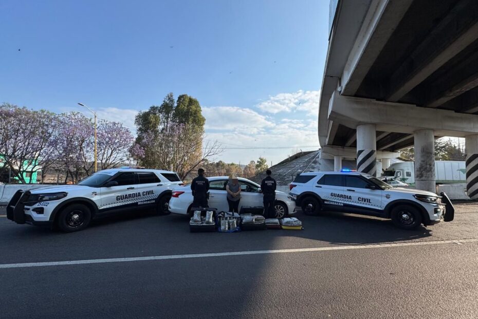 Personal de la Secretaría de Seguridad Pública (SSP) detuvo a una mujer que transportaba cinco maletas con aproximadamente 65.3 kg de hierba verde seca con las características propias de la mariguana. El aseguramiento ocurrió durante labores de prevención y vigilancia sobre la Autopista de Occidente.