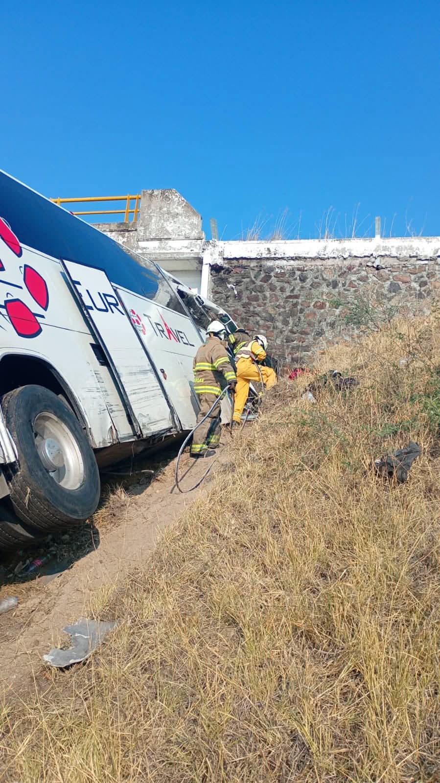 Las fuentes indicaron que uno de los vehículos involucrados en el percance es de la empresa Traninn Logistic, cuyos contenedores de gas afortunadamente no presentaron fuga; y la otra unidad es el autobús de la compañía EuroTravel, el cual terminó siniestrado a la orilla del camino y a punto de volcar.
