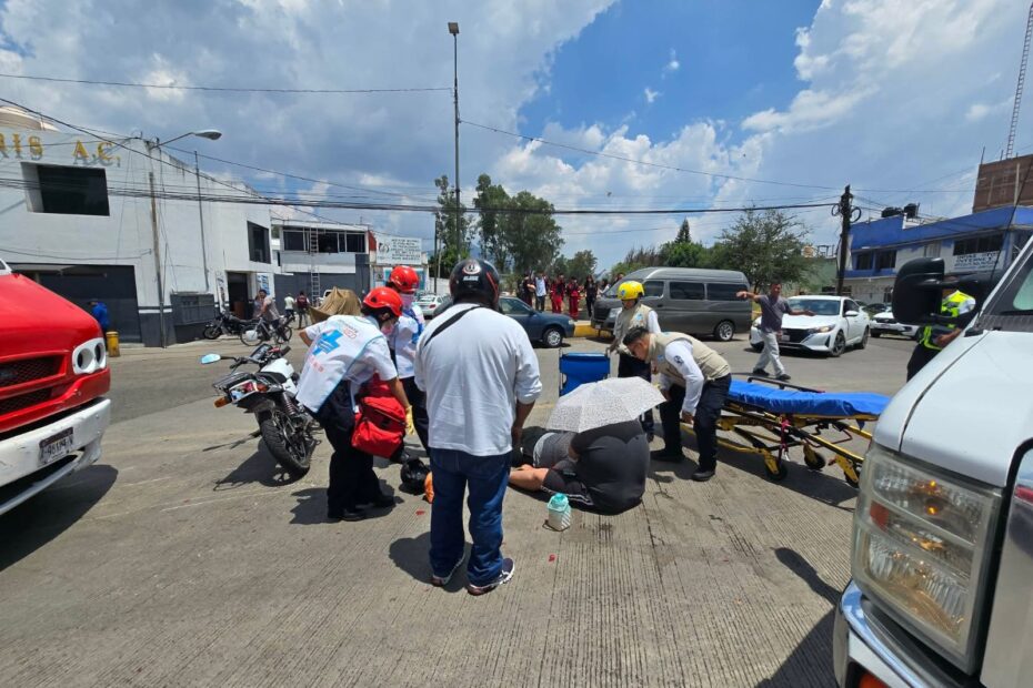 Morelia, Mich.- Jueves 23 de abril de 2026.- Una mujer que viajaba en motocicleta resultó lesionada tras ser impactada por un camión de pasajeros de la Ruta Roja 1, sobre la avenida Siervo de la Nación, en la ciudad de Morelia, informaron autoridades policiales.