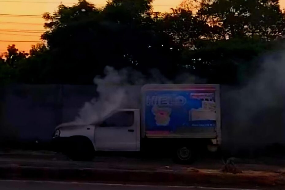 El incidente ocurrió en la intersección de la avenida Lázaro Cárdenas y la calle Ricardo F. Magón, cerca del establecimiento “Carnitas Torres”. De acuerdo con los reportes policiales, el conductor de una camioneta Nissan NP300, propiedad de una empresa local de hielo, notó humo saliendo del motor y detuvo el vehículo de inmediato.