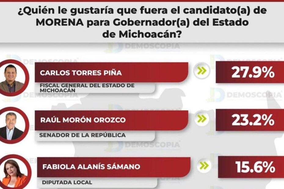 Algo digno de apreciar es una encuesta presentada por la empresa Demoscopia y el diario nacional La Jornada presentada el pasado 17 de abril en la cual se les preguntó a los ciudadanos ¿quién le gustaría que fuera el candidato de Morena para gobernador de Michoacán? y la medición fue ganada por Torres Piña con un 29. 7 por ciento de los encuestados dejando a Raúl Morón en el segundo lugar con un 23.2 por ciento y en el tercero a Fabiola Alanís con un bajo porcentaje del 15.6 en las preferencias, en la lista aparecen otros actores políticos con muy bajos números.